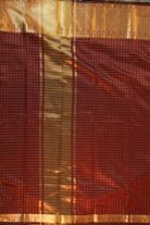 Pallu: Heavy, Fully Woven Gold Zari Pallu with broad horizontal zari panels and subtle striped detailing