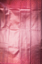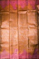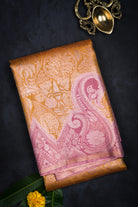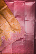 The Golden Tissue Semi Kanchi Saree is beautifully woven with subtle pink zari motifs across the shimmering golden body. A rich zari pallu adds depth and elegance, making this saree a refined balance of tradition and charm.