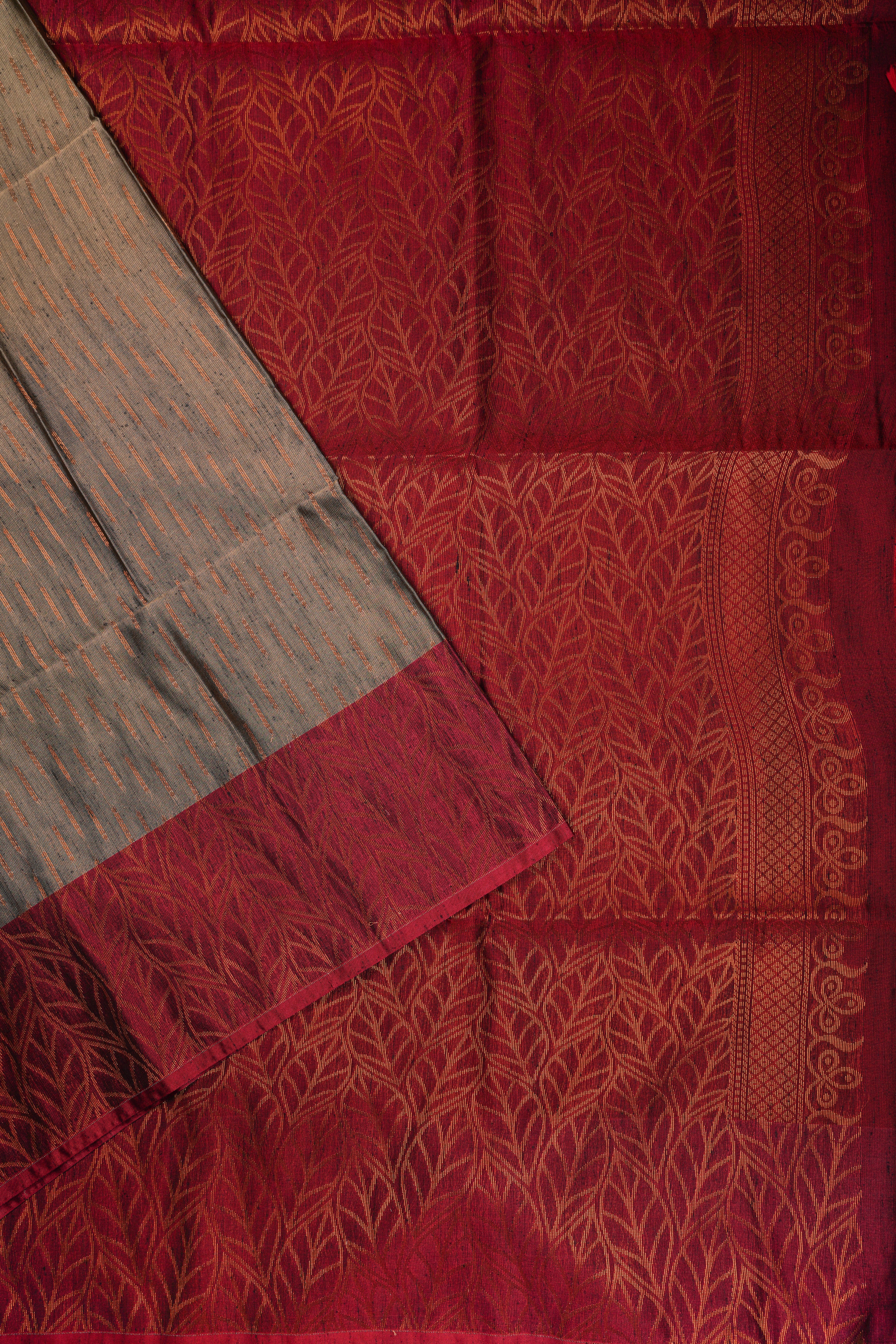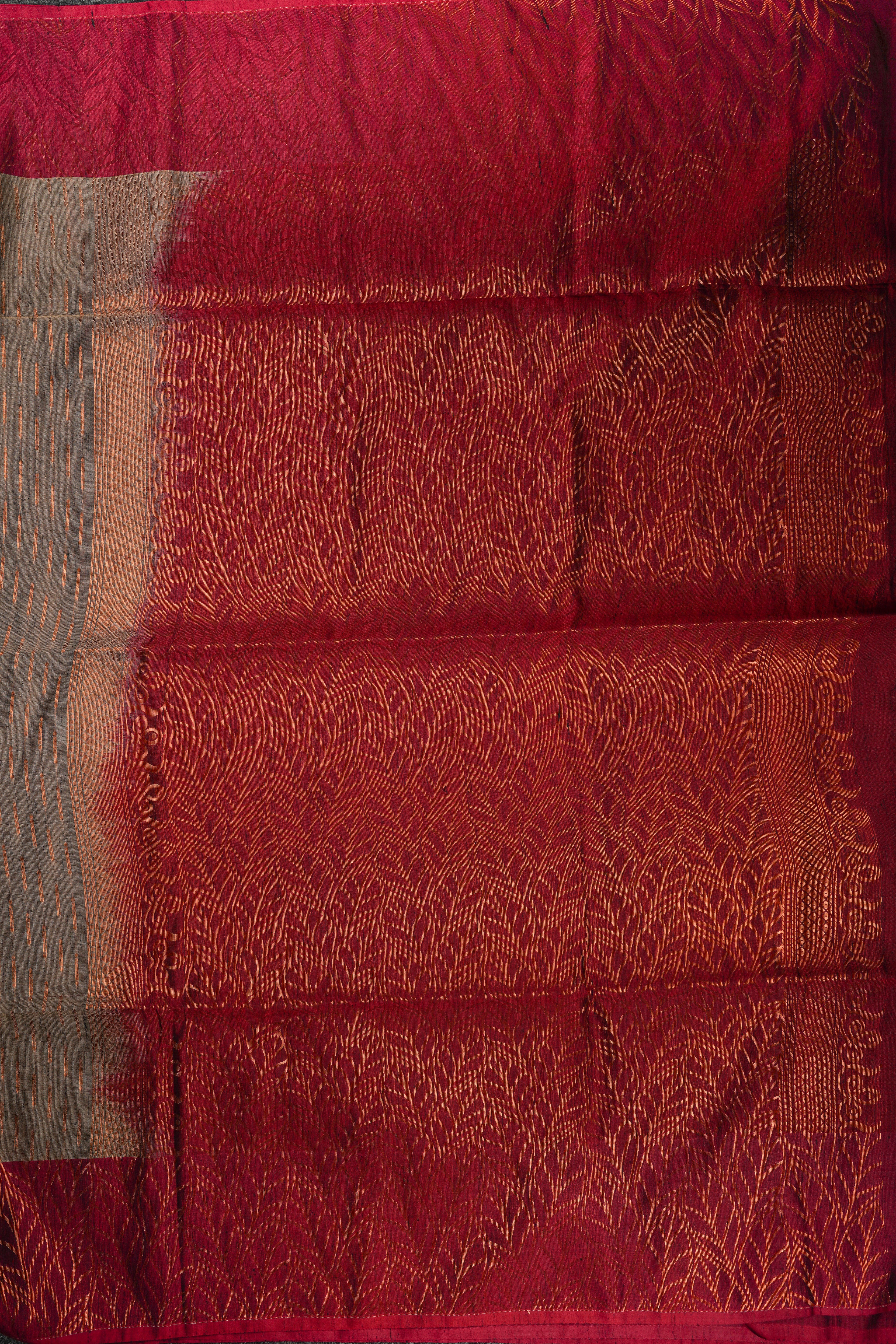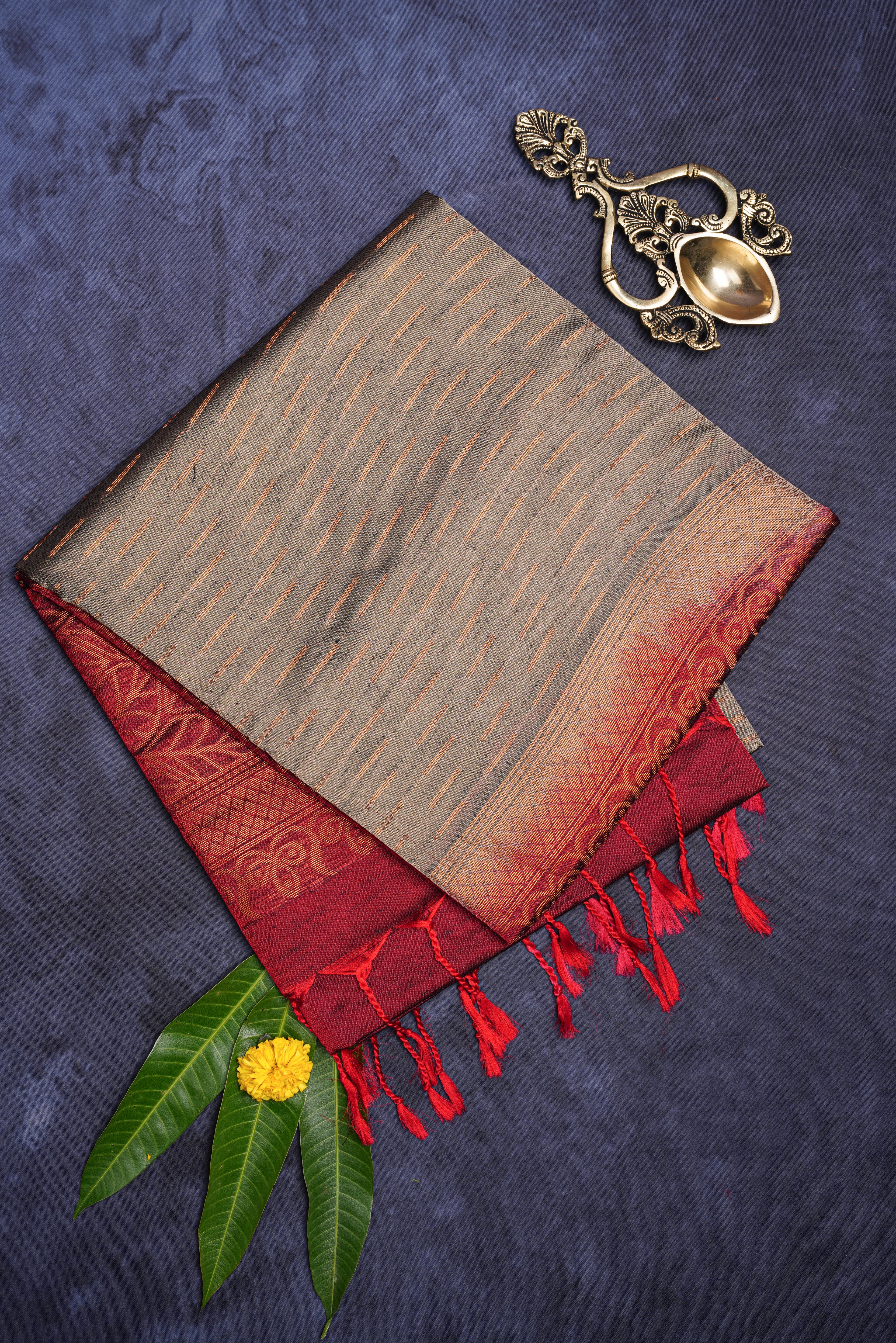 This soft silk saree features a grey body with a rich maroon border and pallu, finished with delicate tassels for a playful, elegant touch. The smooth fabric drapes comfortably and gracefully, perfect for weddings, festivals, or special occasions.