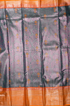 The Metallic Blue Semi Kanchi Saree features a lustrous blue body with intricate zari weaving and a contrasting border and pallu. Its subtle shimmer and graceful finish make it a timeless blend of tradition and sophistication.