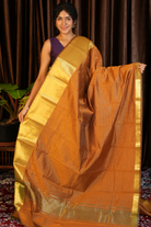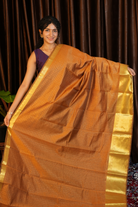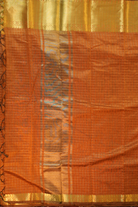 Pallu: Richly Woven Gold Zari Pallu with a horizontal zari panel and subtle pattern detailing